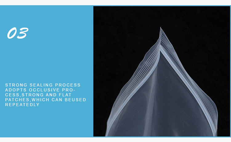 Fitur: Tas Ziplock sing bisa ditutup maneh bisa ditutup maneh, awet lan kuwat, ora beracun, ora enak, bebas asam, duwe isolasi anti banyu sing apik, lan bisa didaur ulang 100% lan ramah lingkungan.