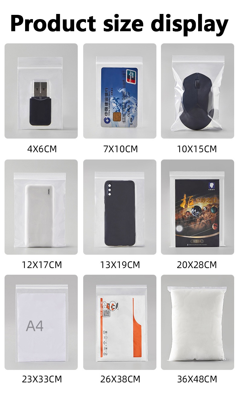 Aplikasi: Resealable Ziplock Bags macem-macem ukuran cocok kanggo kothak beda, kayata panyimpenan, sandhangan, sepatu, perhiasan, medical, aksesoris hardware, etc.